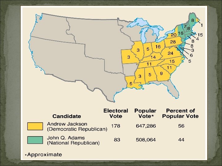 Election of 1828 J. Q. A. vs. Andrew Jackson wins…. 178 -83 (electoral votes) “Common Man”, from the West Support came from who? Voter turnout increases Power shift to west from east