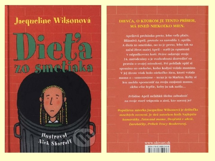 Poznámky: Jacqueline Wilsonová Dieťa zo smetiska (Dieťa zo smetiaka) • literárny druh: epika • literárny žáner: dievčenský román • literárna forma: próza • téma: hľadanie biologickej matky • idea: túžba po materinskej láske a spoznaní svojej minulosti • typ rozprávania: ja - rozprávanie