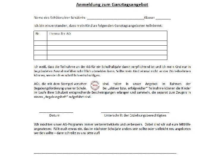 Informationen zur Anwahl: So sieht euer Anwahlzettel aus: Alle diese AGs könnt ihr anwählen! Zusätzliches regelmäßiges Nachmittagsangebot: • Hausaufgabenhilfe, Klassen 5 bis 7, Kevin, Montag bis Donnerstag, 13. 30 bis 15. 00, Bücherei • Energie- und Technikmanagement, Klassen 5 -12, Herr Spaltenstein Blocktermine nach Vereinbarung • Förderkurse, Klassen 5 bis 7, Herr Altmüller