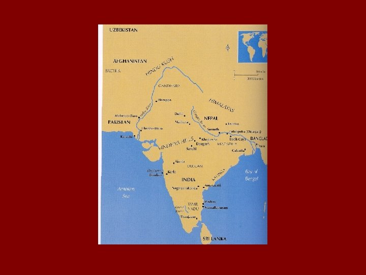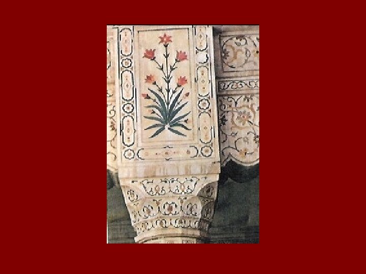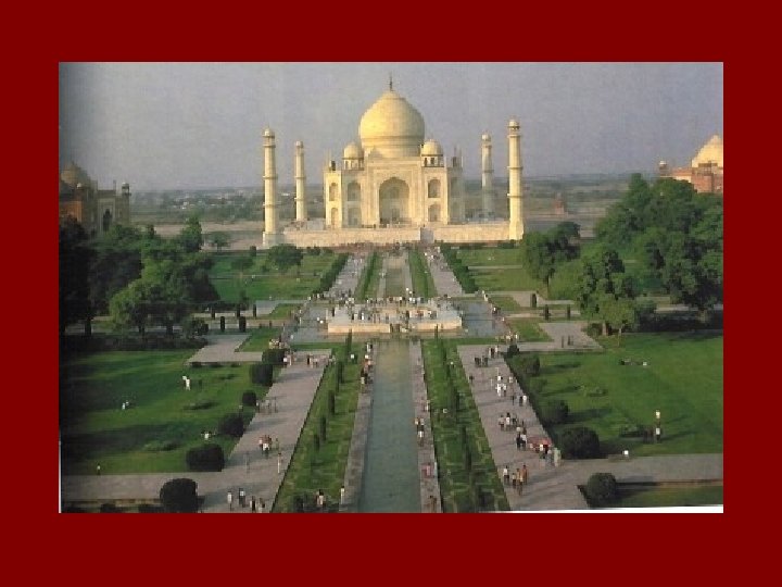 Taj Mahal • Taj Mahal (“Crown of the Palace”) is located in Agra • It was built as a tomb for Mumtaz Mahal (“Light of the palace”), Shan Jahan’s wife built between 1631 -1643 • Built of white marble and decorated with semi precious gems; motifs: floral, vegetation, geometric abstract motifs and calligraphy ( • It bulbous dome; pointed arches • Garden represents paradise
