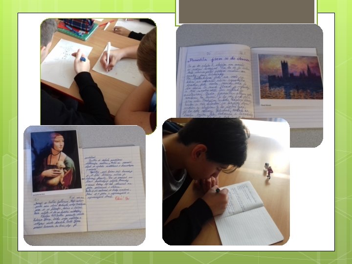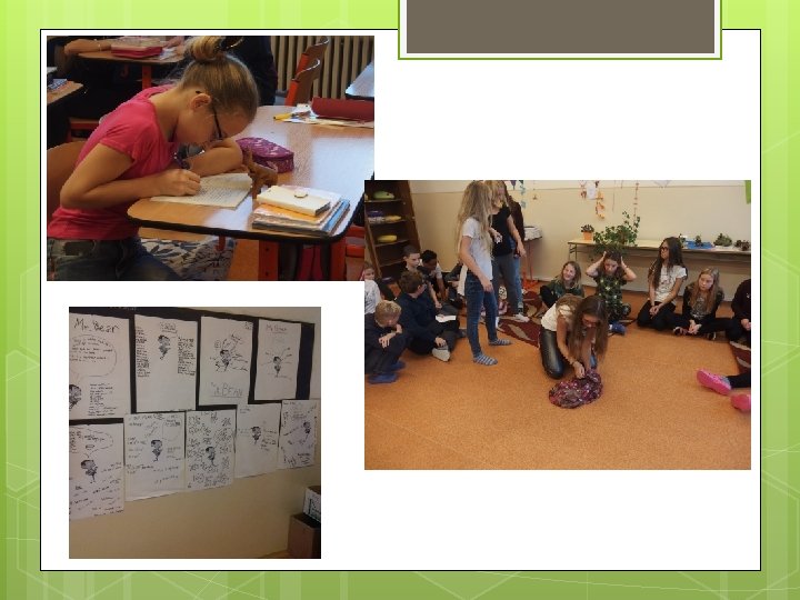 …………………. o o o HUDBA – poslech hudby se zavřenýma očima popis, líčení, vyprávění. Popis domu, jednotlivých pokojů ( hra loto). Natoč VIDEO nějaké činnosti – popiš postup. PŘÍSLOVÍ a ZVÍŘÁTKA – píší bajky s poučením. POZITIVNÍ VĚŠTBA – obtisk ruky.