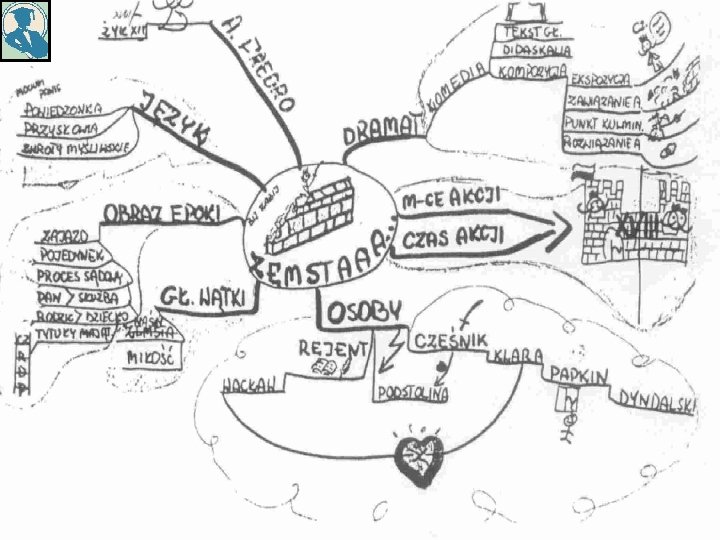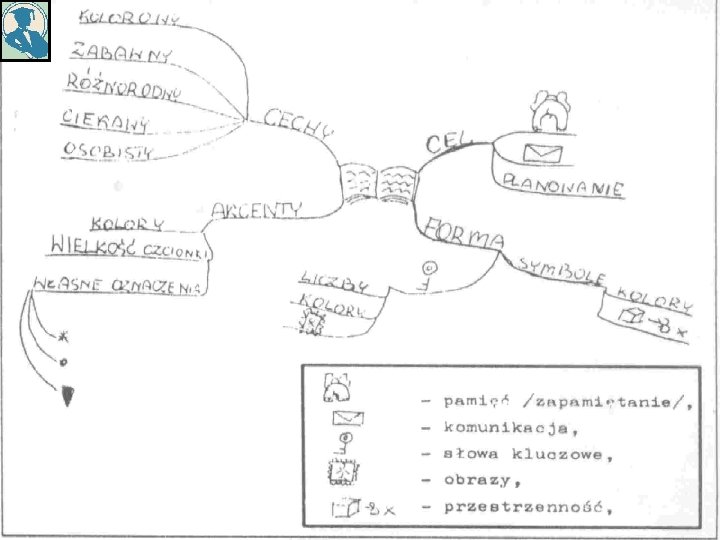 BUDOWA MAPY MYŚLI: • kartka najlepiej formatu A 3 ułożona poziomo • w środku główny temat w formie znaku, symbolu, rysunku • napisy, symbole, rysunki na całej przestrzeni • pisz tylko słowa- klucze • używaj drukowanych liter • z wyrazów twórz konary i gałęzie • stosuj różne kolory • strzałkami zaznaczaj wzajemne relacje • wykorzystuj wykrzykniki - !, gwiazdki - *, znaki zapytania - ? , figury- <>, chmurki, dymki, rysunki, symbole- $ ~ @ & + # % • na końcu ustal kolejność (referowania lub pisania)- cyframi