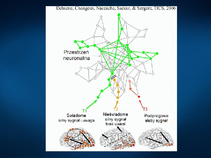 Przestrzeń neuronalna Aktywność kory zmysłowej wrażenia, myśli. Strumienie informacji kora zmysłowa skojarzeniowa tworzą na tyle stabilne stany w mózgu, że można je odróżnić od szumu, procesów przypadkowych. Korelacja aktywności neuronów w korze V 1 z obrazem padającym na siatkówkę jest słaba (~10%), o zmroku jeszcze mniej, większość to pobudzenia wewnętrzne, dlatego: Wiesz co widzisz, widzisz co wiesz (góralka z Zakopanego). A duchy widać tylko w ciemności …