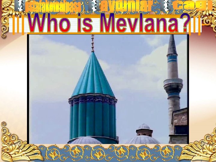 Bu canım var oldukça ben Kur'ana tutsağım Muhammed Mustafanın yolundaki toprağım Benden başkaca bir söz nakledenler olursa Hem onu söyleyenden hem o sözden uzağım One of the great spiritual masters, philosopher and poetic geniuses of mankind, the founder of the Mawlawi Sufi order (1207 Balkh, Afghanistan – December 17 th, 1273 Konya, Turkey)