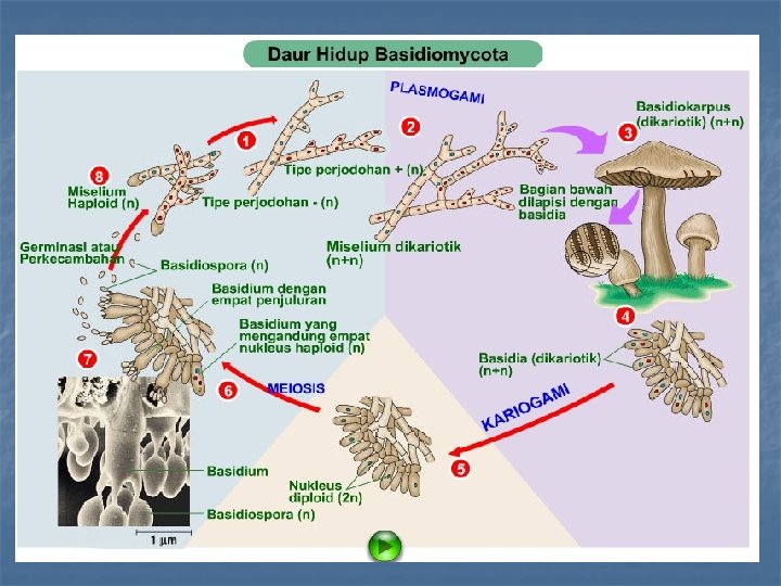 c. Subdivisi Basidiomycota (Jamur Basidium) n n n Jamur Basidiomycota contohnya jamur merang, jamur kuping, dan jamur kayu. umumnya makroskopik (dapat dilihat dengan mata), berbentuk seperti payung atau tudung. Di sebelah dalam payung terdapat “sisir” atau “bilah” yang mengandung basidium. Basidium berisi spora (basidiospora) yang dapat ditebarkan angin dan jika jatuh di tempat cocok akan tumbuh menjadi hifa baru. Tubuh jamur basidiomycota berupa tubuh buah dari kumpulan benang miselium. Zigot dihasilkan oleh perkawinan antara hifa “positif” dan “negatif”.