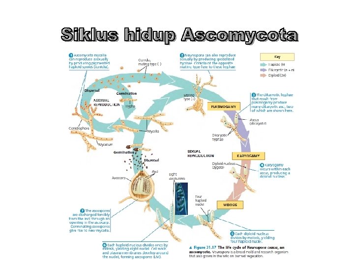 o Dinding selnya tersusun atas zat kitin o Unisel dan multiseluler o Hifa bersekat, membentuk badan buah yang disebut ascokarp o Mengandung inti haploid o Reproduksi vegetatifnya dg membentuk konidiospora o Reproduksi generatifnya dg konjugasi yang menghasilkan askospora o Contoh : Saccharomyces cerevicae, Penicillium notatum, Aspergillus wentii, dan lainnya
