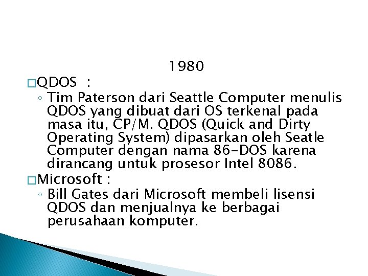 � QDOS 1980 : ◦ Tim Paterson dari Seattle Computer menulis QDOS yang dibuat dari OS terkenal pada masa itu, CP/M. QDOS (Quick and Dirty Operating System) dipasarkan oleh Seatle Computer dengan nama 86 -DOS karena dirancang untuk prosesor Intel 8086. � Microsoft : ◦ Bill Gates dari Microsoft membeli lisensi QDOS dan menjualnya ke berbagai perusahaan komputer.