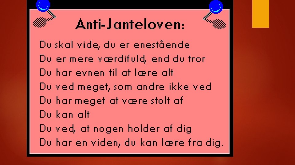 JANTELOVEN Du skal ikke tro at du er noe. Du skal ikke tro at du er like så meget som oss. Du skal ikke tro du er klokere enn oss. Du skal ikke innbille deg du er bedre enn oss. Du skal ikke tro du vet mere enn oss.