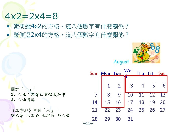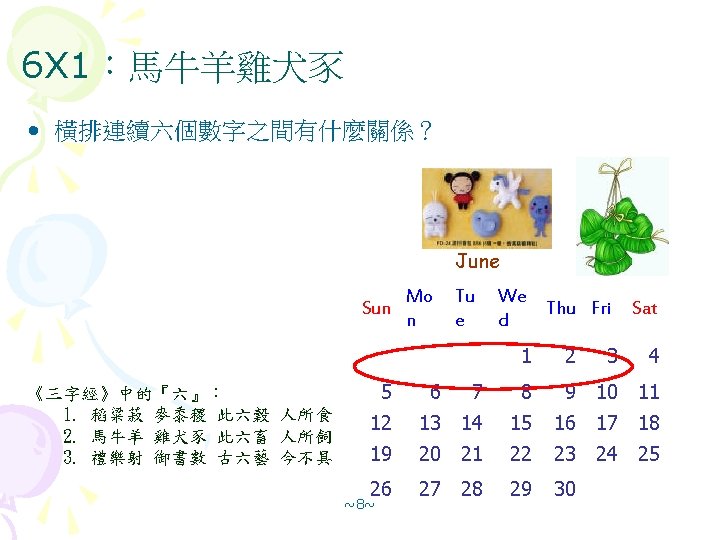 2 x 3=3 x 2=6 • 隨便選 2 X 3的方格,這六個數字有什麼關係? • 隨便選 3 x 2的方格,這六個數字有什麼關係? December Sun Mo n Tue We d Thu Fri Sat 1 2 3 4 5 6 7 8 9 10 11 12 13 14 15 16 17 18 19 20 21 22 23 24 25 26 27 28 29 30 31 ~9~