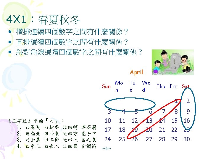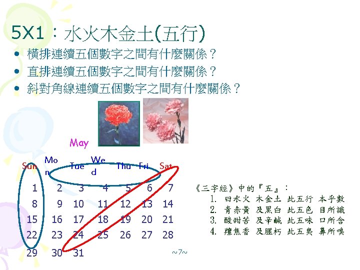 2 X 2:田 • 隨便選 2 X 2的方陣,你能不能找出這四個數字有什麼關係 ? February Sun Mo n Tu e We Thu Fri d 1 2 3 4 Sat 5 6 7 8 9 10 11 12 13 14 15 16 17 18 19 20 21 22 23 24 25 26 27 28 ~4~
