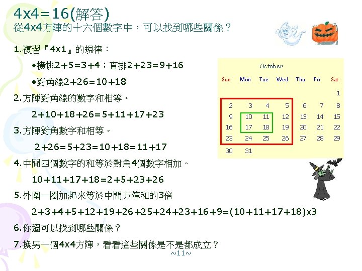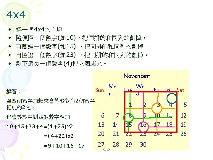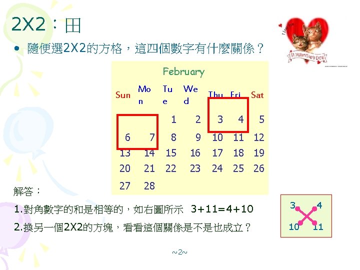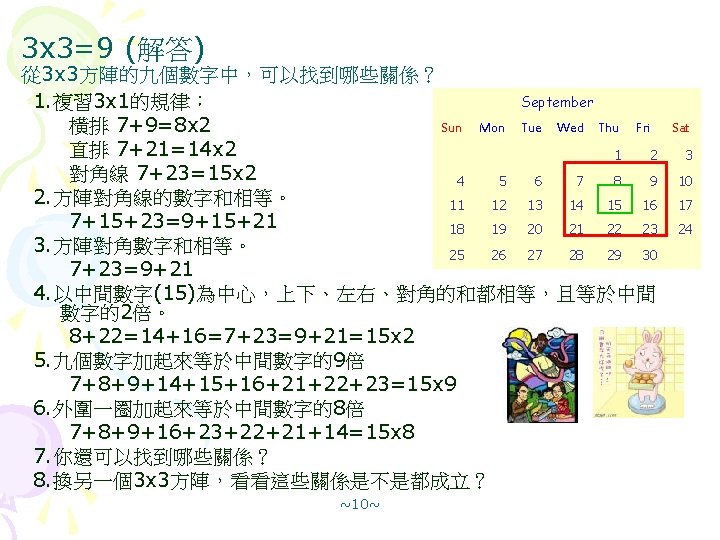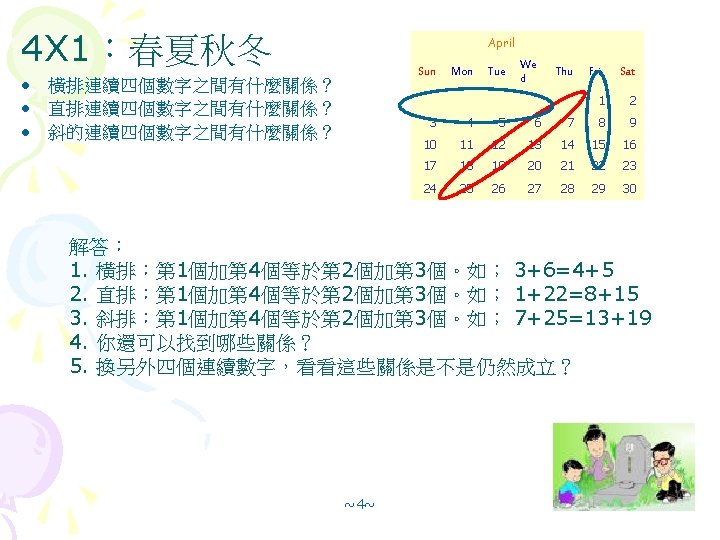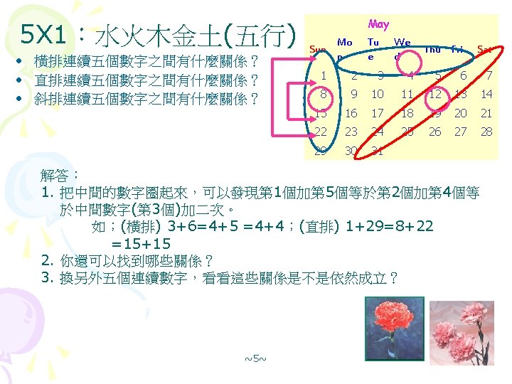 January Sun Mon Tue Wed Thu Fri Sat Slides: 12 Download presentation 月曆裡的數字玄機 January Sun Mon Tue Wed Thu Fri Sat 1 2 3 4 5 6 7 8 這些數字之間有什麼關係? 9 10 11 12 13 14 15 (解答版) 16 17 18 19 20 21 22 23 24 25 26 27 28 29 30 31 2 x 3=3 x 2=6(解答) December Sun Mon Tue Wed 1. 複習『3 x 1』的規律 橫排 1+3=2 X 2; 8+10=9 X 2 4 5 6 直排 4+18=11 x 2; 5+19=12 x 2 11 12 13 18 19 20 2. 對角相加,如下左圖所示: 25 26 27 4+19=5+18=11+12 3. 對角相加,如下右圖所示 1+10=3+8=2+9 4. 你還可以找到哪些關係? 5. 換另一個2 X 3或 3 X 2方塊,看看這些關係是不是都成立? 4 11 18 5 12 19 1 2 8 2 3 9 ~7~ 10 Thu Fri Sat 1 2 3 7 8 9 10 14 15 16 17 21 22 23 24 28 29 30 31