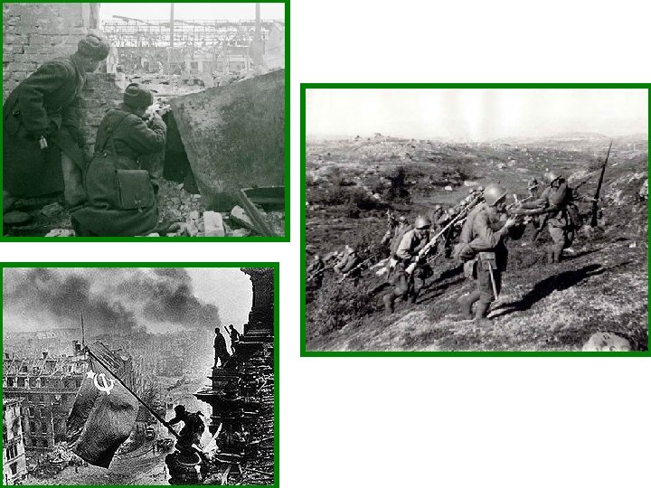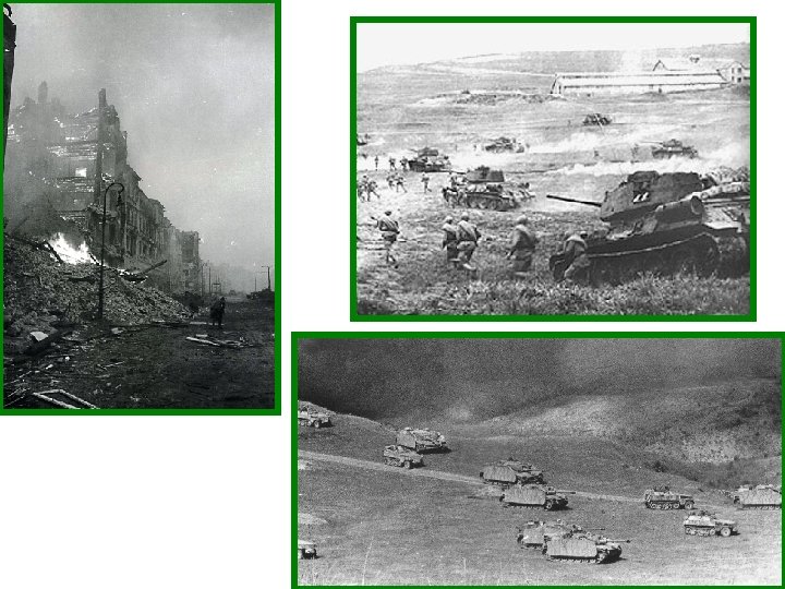 The European Theater • Allied troops liberated Paris by the end of August. – In March, 1945, they crossed the Rhine River and advanced into Germany. – At the end of April 1945, Allied armies in northern Germany moved toward the Elbe River, where they linked up with the Soviets. • The Soviets had come a long way since the Battle of Stalingrad in 1943. – They had soundly defeated the German forces at the battle of Kursk (July 5 -12), the greatest tank battle of WWII. – Soviet forces now began a steady advance westward reoccupying Ukraine by the end of 1943, then moved into the Baltic states by early 1944. – Advancing along a northern front, Soviet troops occupied Warsaw in January, 1945 and entered Berlin in April. – Meanwhile, Soviet troops along a southern front swept through Hungary, Romania, and Bulgaria.