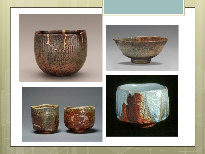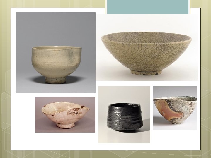 There are many different tea bowl shapes. http: //flyeschool. com/content/japanese-tea-bowl-shapes Chawan (tea bowls) created by Japan’s most famous potters can be worth hundreds to thousands of dollars. Often Hand built Have own personal character. Irregularities and imperfections are prized: they are often featured prominently as the "front" of the bowl. wabi-sabi is the Japanese art of finding beauty in imperfection… of accepting the natural cycle of growth, decay, and death. Designed to fit the hand well