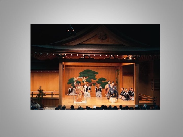 Japanese Theatre-scenery and costumes • • • Scenery: Usually a tapestry on back wall A tree was always a part of the scene Items suggested symbols/actions Costumes: ornate • CHARACTERS: • Major actors wore large wooden masks • 15 standard masks used in Noh theatre