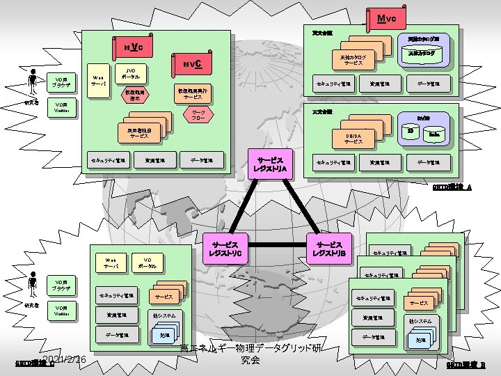 VOs in the World • NVO (USA), AVO (EU), Astro. Grid (UK) • Germany, Canada, Russia, Australia • India, China, JAPAN Protocols to interconnect VOs → International Virtual Observatory Alliance (IVOA) 2021/2/26 高エネルギー物理データグリッド研 究会