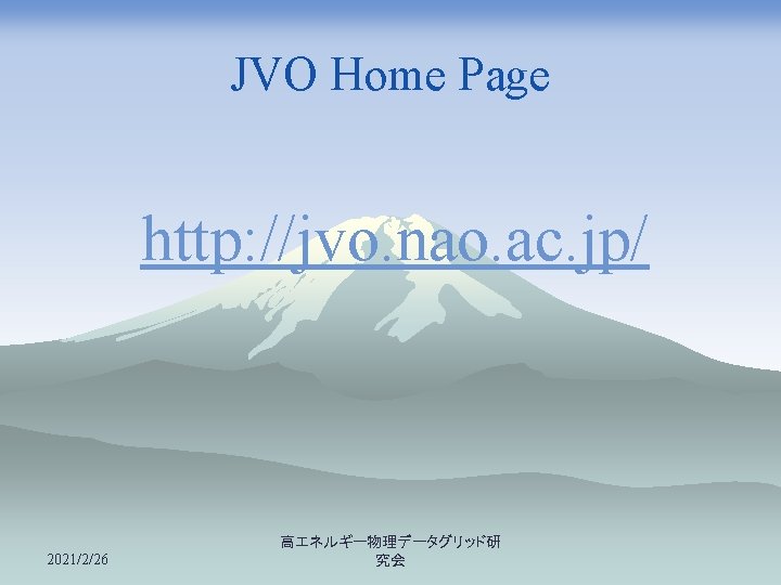 Japanese Virtual Observatory Masatoshi Ohishi National Astronomical Observatory of Japan and Sokendai masatoshi. ohishi@nao. ac. jp 2021/2/26 高エネルギー物理データグリッド研究会