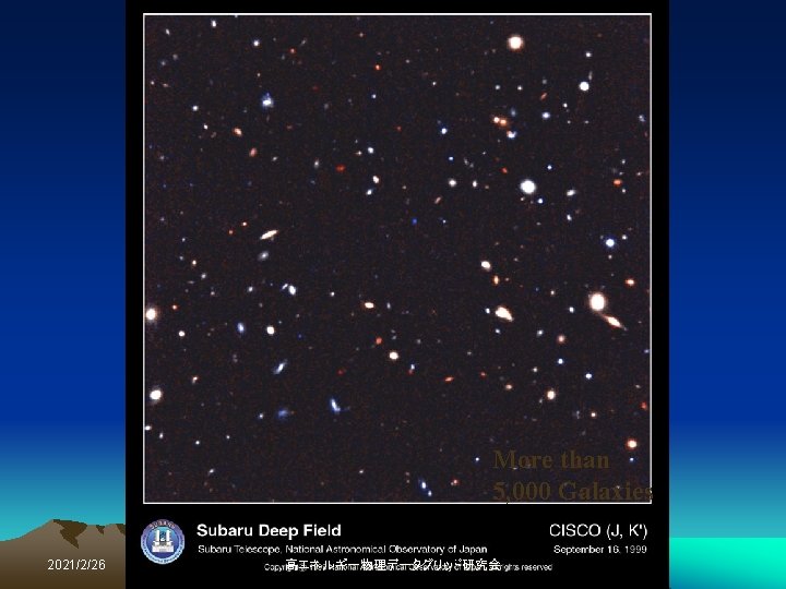 Unknowns of Astronomy • Physics just after the Big Bang ? • How Galaxies were formed ? • Averaged density of the Universe etc. → statistical analyses for homogeneous survey data are crucial 2021/2/26 高エネルギー物理データグリッド研究会