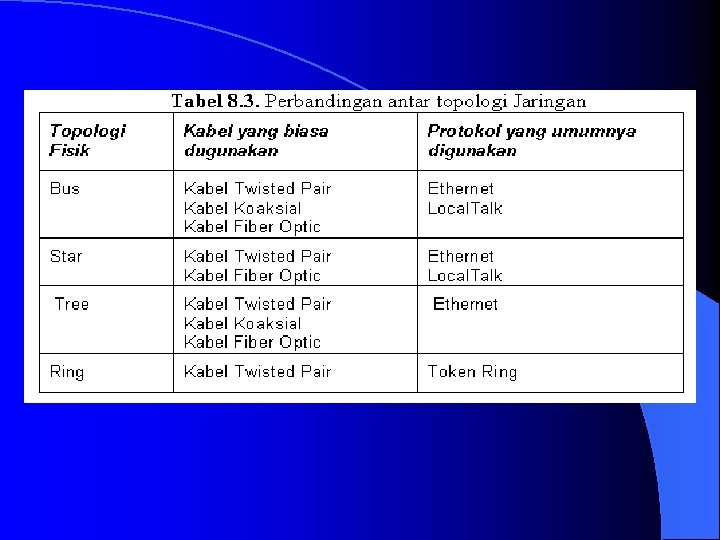 Topologi Bus l Topologi bus diimplementasikan dengan menggunakan media fisik berupa kabel koaksial. Topologi ini umumnya digunakan untuk jaringan komputer yang terhubung secara sederhana sehingga komputer-komputer yang terlibat di dalamnya bisa berkomunikasi satu sama lainnya. Realisasi dari topologi bus ini adalah adanya sebuah jalur utama yang menjadi penghubung antar komputer.