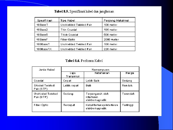 Kabel Fiber Optik Kabel serat optik (fiber optic) mempunyai kemampuan mentransmisi sinyal melewati jarak yang lebih jauh dibanding kabel koaksial maupun kabel twisted, juga mempunyai kecepatan yang baik. Hal ini sangat baik digunakan ketika digunakan untuk fasilitas konferensi Radio atau layanan interaktif. 10 Base. F adalah merujuk ke spesifikasi untuk kabel fiber optik dengan membawa sinyal Ethernet.