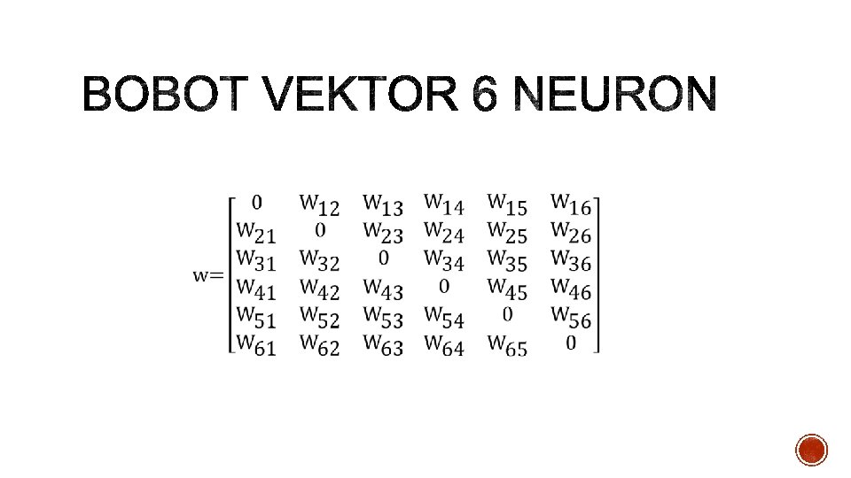 § Jaringan Hopfield Diskrit merupakan jaringan saraf tiruan yang terhbung penuh (fully connected), yaitu bahwa setiap unit terhubung dengan setiap unit lainnya. § Jaringan ini memiliki bobot-bobot yang simetris. § Pada jaringan Hopfield, setiap unit tidak memiliki hubungan dengan dirinya sendiri. § Secara matematik hal ini memenuhi wij = wji untuk i ≠ j dan wij = 0 untuk i = j. § Fungsi aktivasi yang digunakan dalam jaringan Hopfield adalah fungsi energy Lyapunov, yaitu sebuah fungsi yang terbatas dan menurun untuk mendapatkan kestabilan pada aktivasinya.