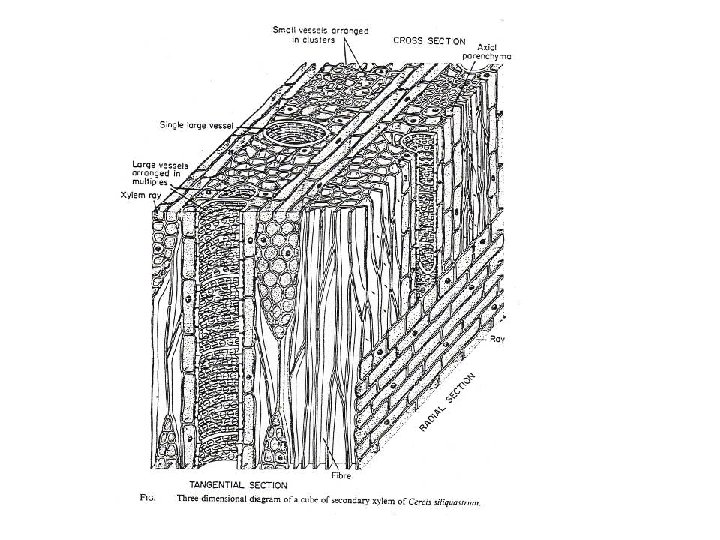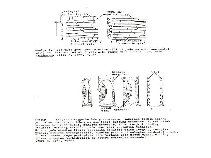 • Serabut xylem Struturnya serupa serabut sklerenkim. Meskipun asalnya dari trakeid yang berdiferensiasi lebih lanjut dengan dinding yang tebal dan noktah sederhana. Serabut dan trakeid saling melekat sehingga sulit dipisahkan tetapi pada umunya sel serabut lebih panjang dari trakeid karena ujungnya yang runcing dapat masuk diantara sel sewaktu memanjang. • Parenkim xylem Sel-sel ini merupakan sel hidup, terdapat baik pada xylem primer maupun xylem skunder. Pada xylem skunder parenkim tersebut berasal dari cambium yang membentuk sel jari-jari sehingga diperoleh selsel yang sumbu panjangnya mengikuti arah jari-jari organ