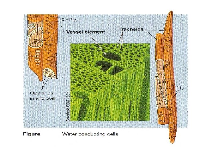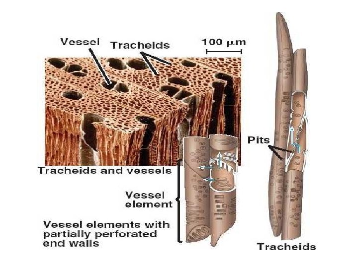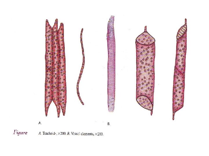TRACHEID - bentuk sel memanjang - lumen tidak terlalu lebar - ujung tidak berperforasi - dinding sel relatif tebal, berlignin - umumnya mempunyai noktah terlindung - membentuk bagian terbesar dari xylem, - bagian itu tidak lama hidup - sayatan tangensial ujung tumpul - diameter kecil