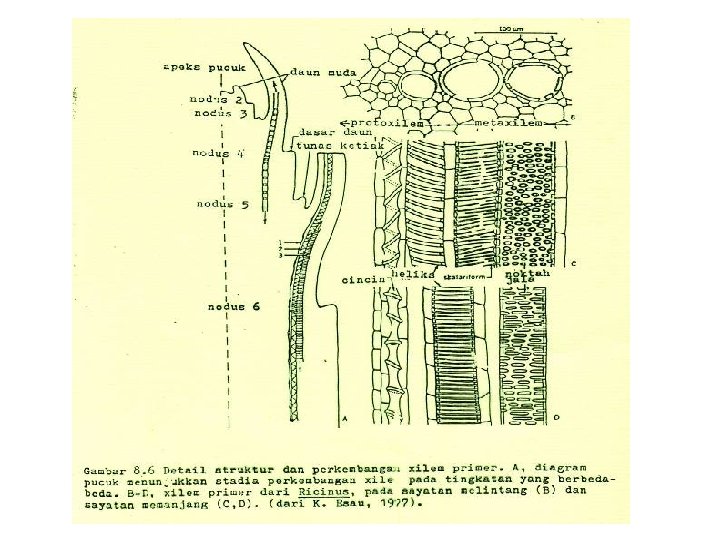 XILEM PRIMER mempunyai tipe-tipe sel yang sama dengan xylem sekunder : trachea, tracheid, serat & sel-sel parenkim perbedaan dengan xylem sekunder, pada xylem primer tidak ada jari-jari empulur (tidak terorganisir menjadi sistem aksial & radial). protoxilem. bagian xylem primer yang dibentuk lebih dahulu pada waktu proses pemanjangan pucuk batang dan ujung akar. metaxylem. bagian xylem primer yang dibentuk kemudian dewasanya setelah selesai periode pemanjangan.