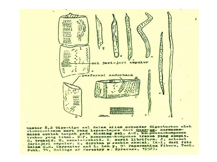 SERAT LIBRIFORM - lebih panjang dari serat tracheid - jumlah noktah amat sedikit - isi sel mati - dinding berlignin - mengalami penyempitan lumen