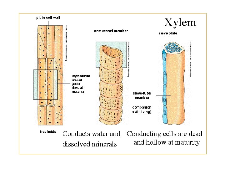 Komponen utama penyusun xylem adalah elemen pembuluh ( trakea ) dan trakeid. Trakea dan trakeid merupakan sel-sel yang mati karena tidak mempunyai sitoplasma dan hanya mempunyai dinding sel. Sel trakea = lubang-lubang terdapat pada ujung-ujungnya sehingga transport air dan mineral atau unsur hara lainnya dapat berlangsung melalui perforasi. Sel trakeid Pada beberapa tempat dinding sel trakeid terdapat bagian-bagian yang tidak menebal yang disebut noktah. . Trakeid tidak terdapat perforasi ( lubang-lubang )