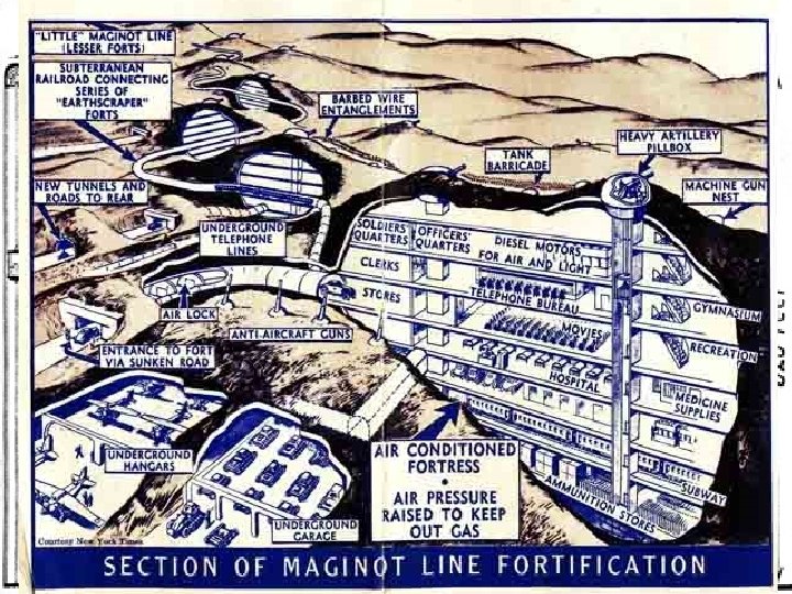 A Europa sob o domínio nazi: a Linha Maginot A França considerava-se protegida pela “Linha Maginot”. Linha Maginot – sistema fortificado, construída pela França entre 1927 -36, na fronteira Noroeste com a Alemanha. A linha era composta por fortificações alinhadas junto à fronteira, composta por casamatas de betão e apetrechada com soldados e mecanismos de guerra nos corredores subterrâneos. Houve um adormecimento por parte da Inglaterra e França, pois não reagiram de imediato à declaração de guerra, permitindo uma rápida acção ofensiva das tropas hitlerianas – Blitzkrieg ou Guerra Relâmpago;