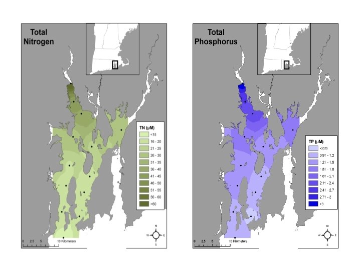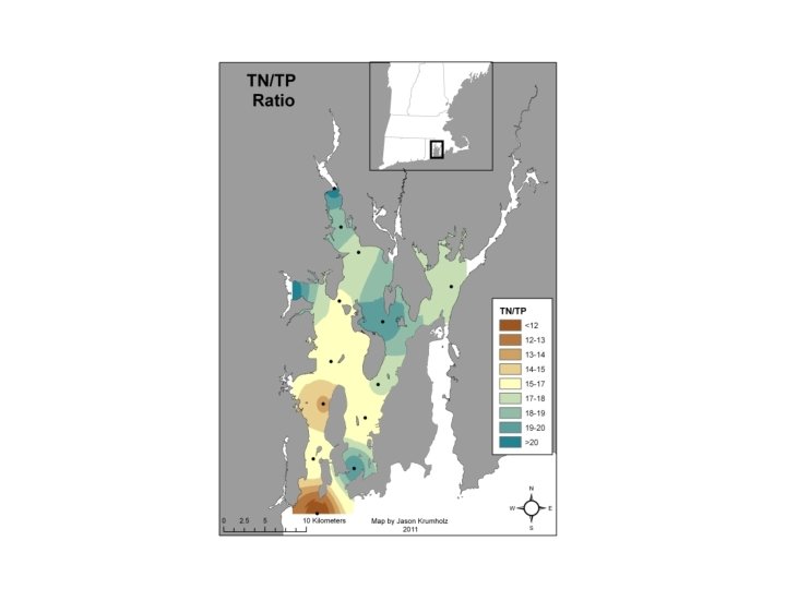 • DIN/DIP ratio <16: 1 is traditionally viewed as a nitrogen limited system. • On an annual average basis, Narragansett Bay remains nitrogen limited throughout, though this limitation is more severe in the mid and lower bay. • On shorter time scales, some areas of the Upper Bay do show evidence of P limitation, which may become even more important as N inputs continue to drop. Average of annual average concentrations (2006 -2010)