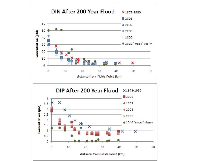 General Form: Nd=N 0 e-kd 100 Modeled PO 4 1: 1 Modeled PO 4 (m. M) Modeled DIN R 2 = 0. 71 80 60 40 20 0 0 20 40 60 Observed DIN (m. M) 10 R 2 = 0. 78 8 6 4 2 0 80 0 2 1200 1000 800 600 400 200 0 10 20 30 Distance from Fields Point (km) 4 6 Observed PO 4 (m. M) 8 10 PO 4 residuals by distance Squared Residual DIN residuals by distance 0 1: 1 40 20 15 10 5 0 0 10 20 30 Distance from Fields Point (km) 40
