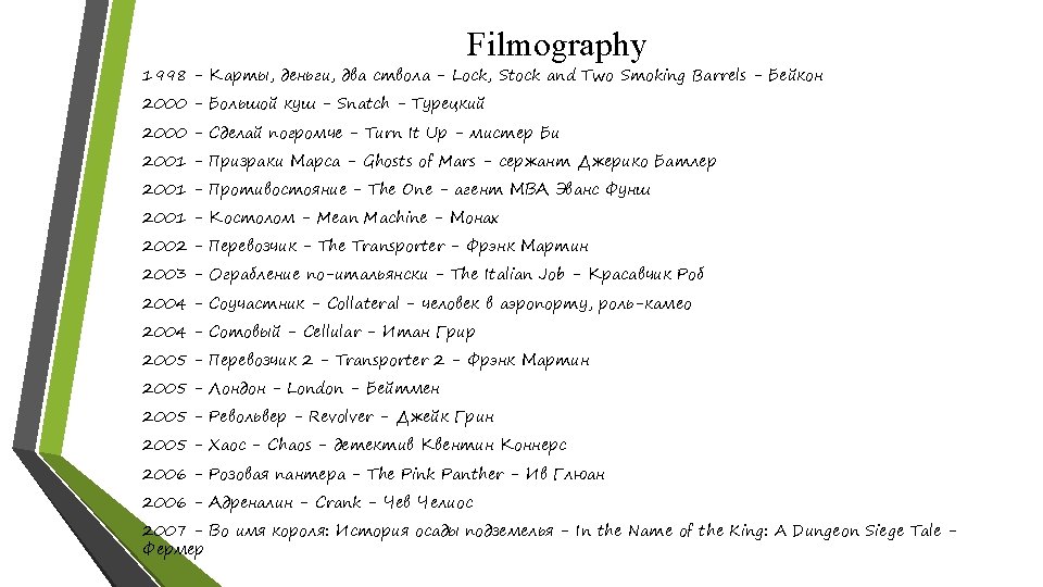 Career Jason Statham film career beginning marked by his participation in the advertising company Tommy Hilfiger. Becoming the face of the brand, Jason Stethem attracted the attention of producer debut and the most famous picture of Guy Ritchie's "Lock, Stock and Two Smoking Barrels. " It was this which was released in 1998 and was the debut film of the actor in the film world. In 2000, Guy Ritchie again invites Jason to take part in the filming of his second film - the film "Snatch". Despite the fact that Jason Stethem played the main role in the film, after Statham career took off in the heavens. Also in 2000 she released the film "turn up", and in 2001 - just a few films: thriller "Ghosts of Mars" and the fantastic film “Confrontation. ” The real breakthrough came in 2002, after the movie "The Transporter. " Picture a huge success, and Jason Statham has become a star thanks to her modern cinema. Later, his creative piggy replenished several other successful projects, including notably the "The Italian Job, " "Mean Machine", "The Expendables" and "Adrenaline".