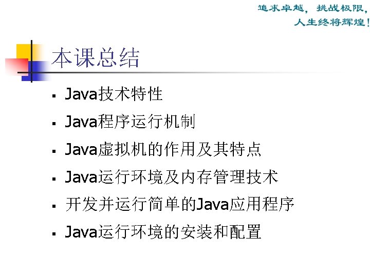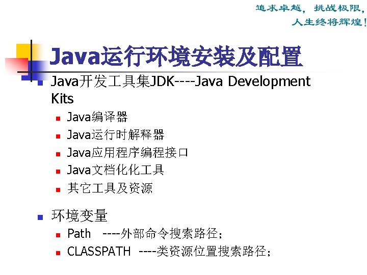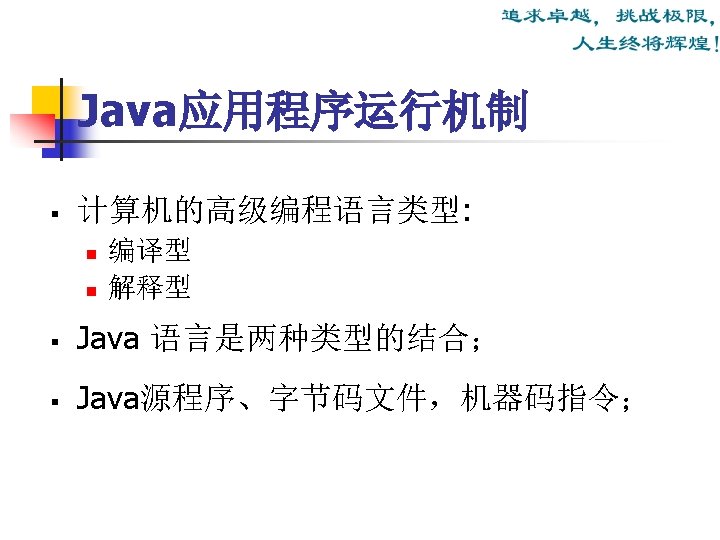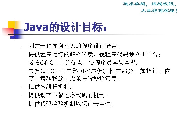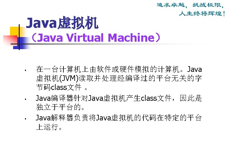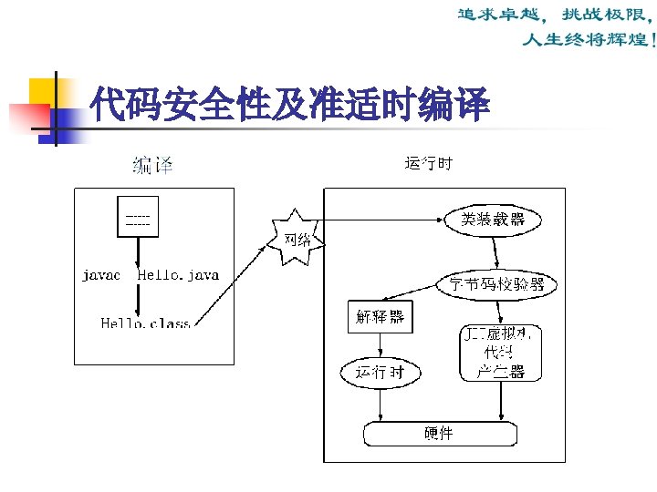 Java运行环境 (The Java Runtime Environment) Java运行环境组成: JRE = JVM + Runtime Interpreter Java运行环境的三项主要功能: n n n 加载代码:由class loader 完成; 校验代码:由bytecode verifier 完成; 执行代码:由 runtime interpreter完成。