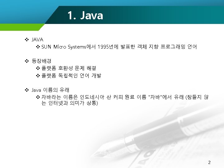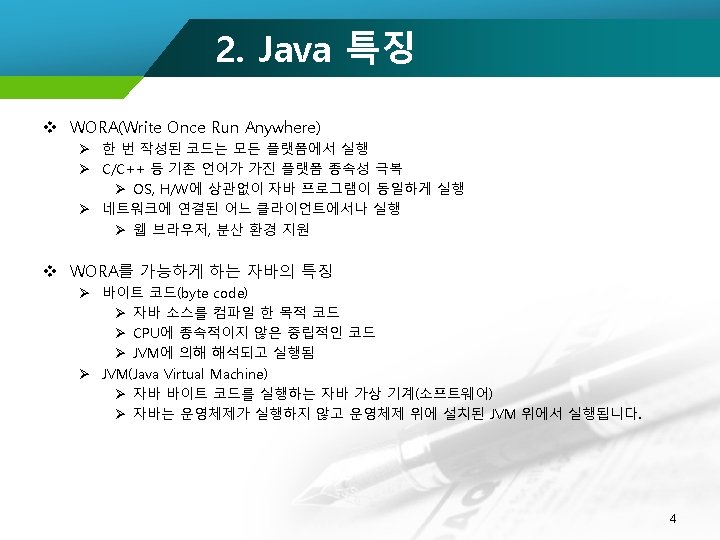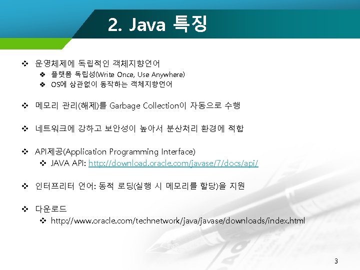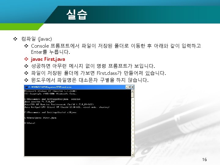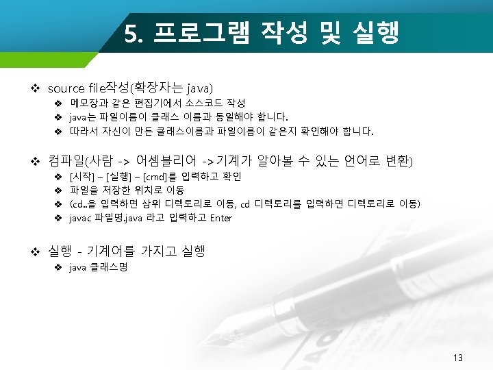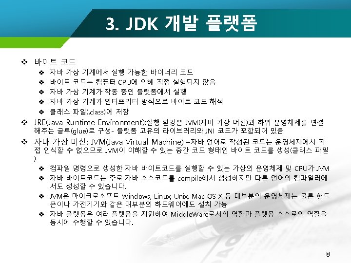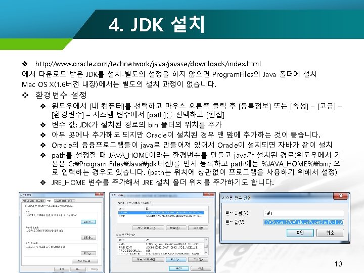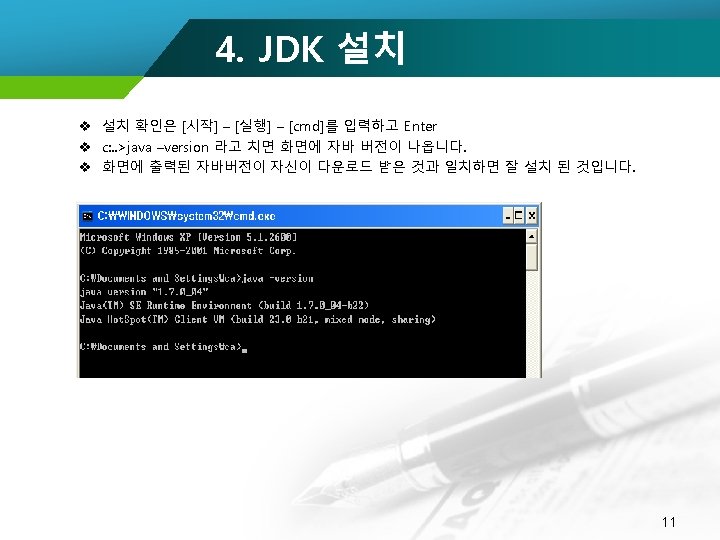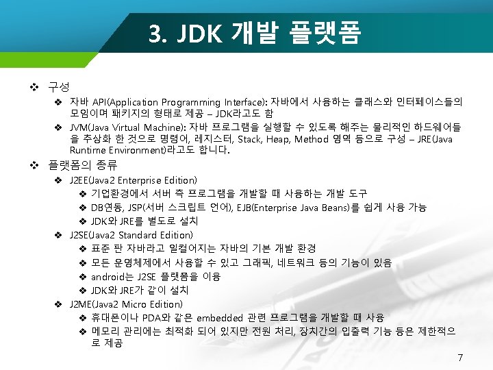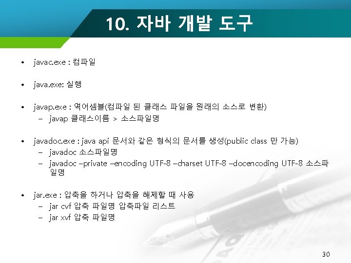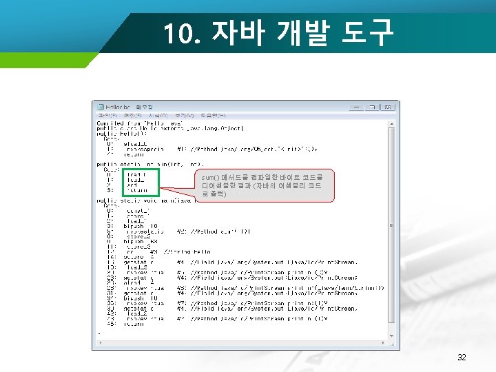 10. 자바 개발 도구 • 디어셈블 – 클래스 파일에 들어 있는 바이트 코드를 텍스트로 볼 수 있게 변환하는 작업 – JDK의 javap. exe 이용(-c 옵션을 이용하면 역어셈블된 코드로 저장) public class Hello { public static int sum(int i, int j) { return i + j; // i와 j의 합을 리턴 } public static void main(String[] args) { int i; int j; char a; String b; final int TEN = 10; i = 1; j = sum(i, TEN); a = '? '; b = "Hello"; java. lang. System. out. println(a); System. out. println(b); System. out. println(TEN); System. out. println(j); } } • Hello. java를 컴파일하는 명령 • 컴파일되면 Hello. class 생성 • Hello. class 파일을 디어셈블하는 명령 • 디어셈블된 결과 Hello. bc 파일 생성 31