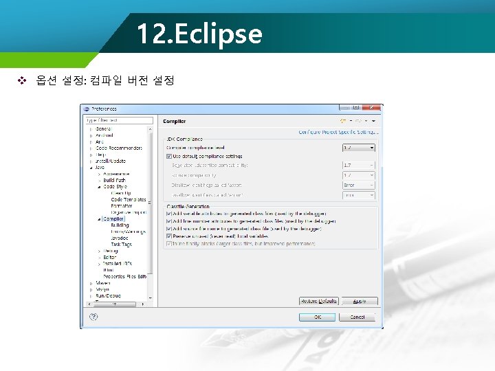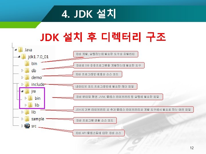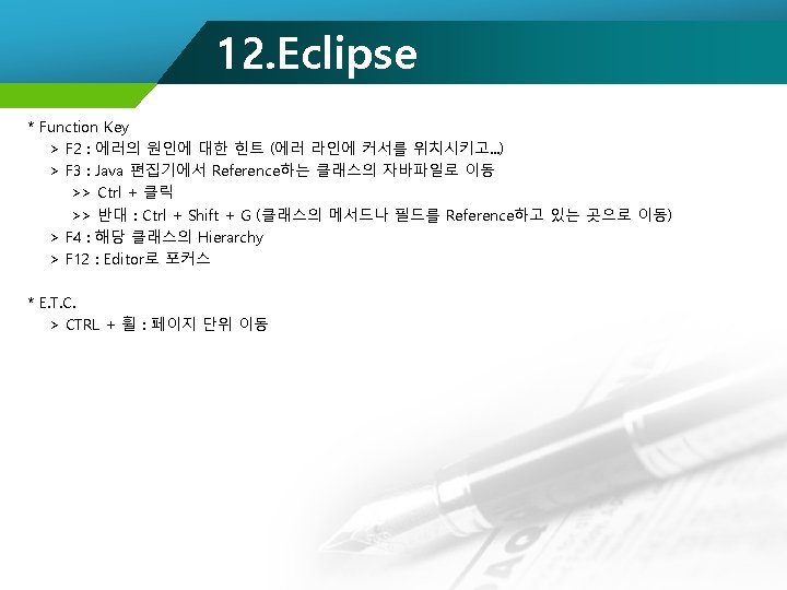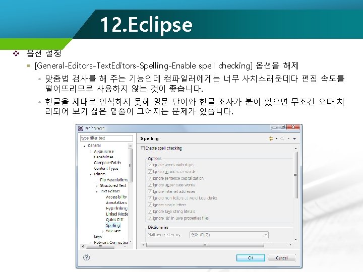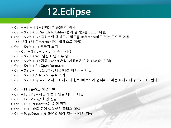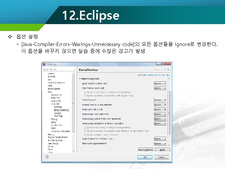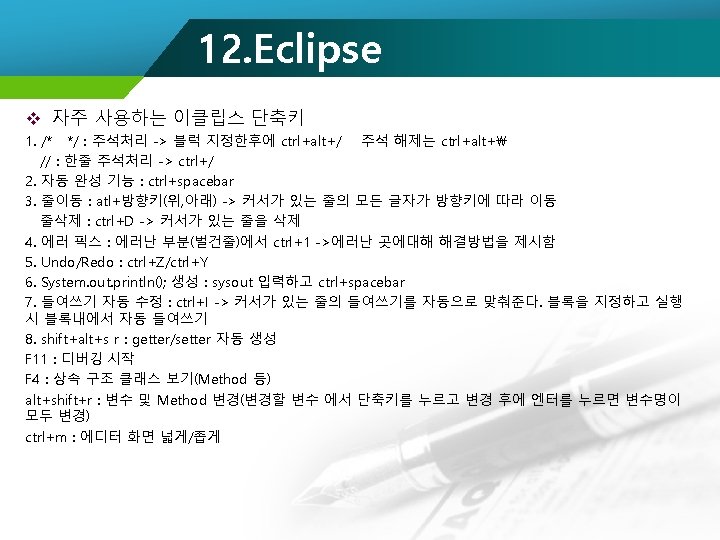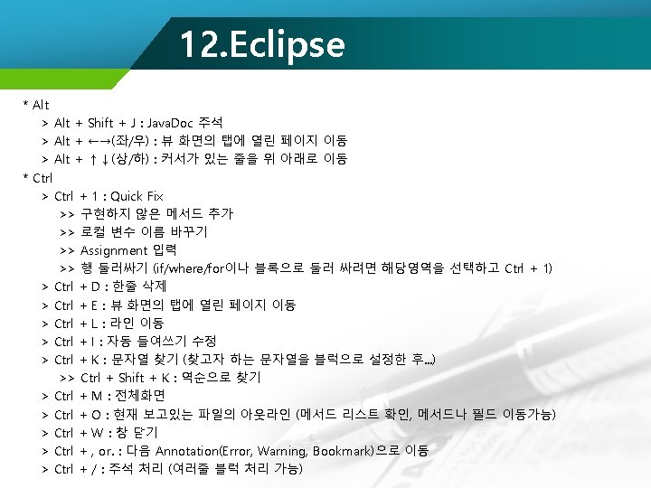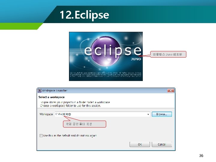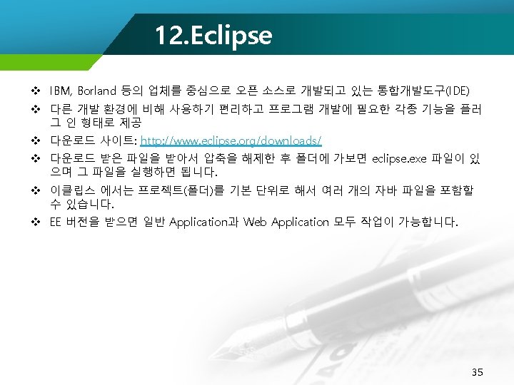 11. 자주 발생하는 에러 v cannot find symbol, cannot resolve symbol v 변수나 Method를 찾을 수 없는 경우 v ‘; ’ expected v ; 이 빠진 경우 v exception in thread main java. lang. No. Such. Method. Error: main v main Method를 찾지 못하는 경우 v exception in thread main java. lang. No. Clss. Def. Found. Error : 클래스명 v 클래스를 찾을 수 없는 경우 v illegal start of expression v 문법적 오류(여는 괄호와 닫는 괄호의 불일치 등) v class, interface, or enum expected v 키워드가 생략된 경우 34
