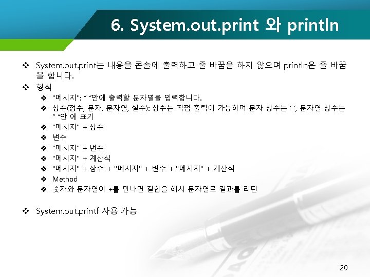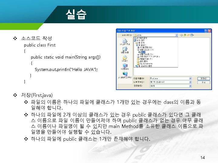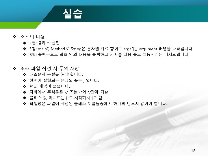 실습 v 소스코드 작성 public class Second { public static void main(String args[]) { System. out. println("안녕하세요"); System. out. println("박문석입니다. "); System. out. println("오늘은 " + 1 + "일차" + " 수업입니다"); System. out. println("3 + 4 = " + 3 + 4); System. out. println("3 + 4 = " + (3 + 4)); System. out. println("3 * 4 = " + 3 * 4); } } v 결과 안녕하세요 박문석입니다. 오늘은 1일차 수업입니다 3 + 4 = 34 3+4=7 3 * 4 = 12 21