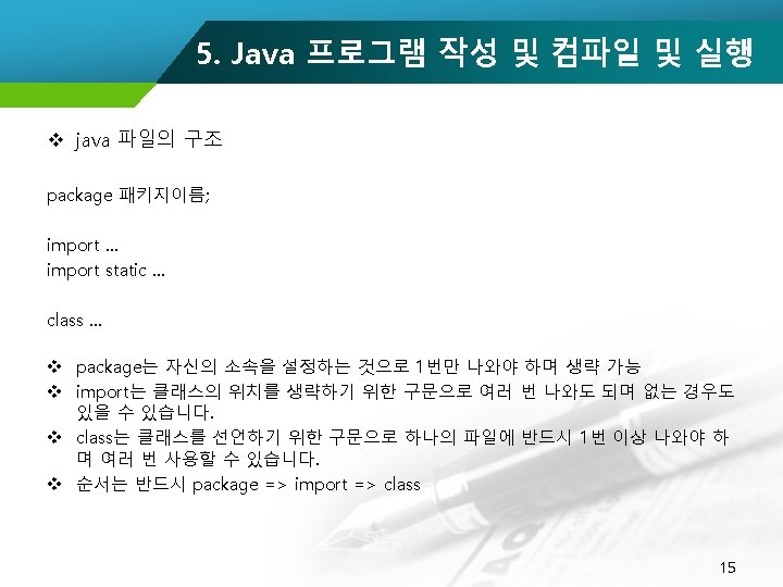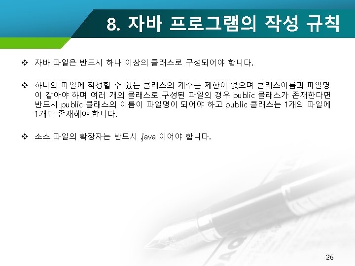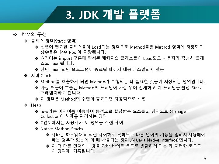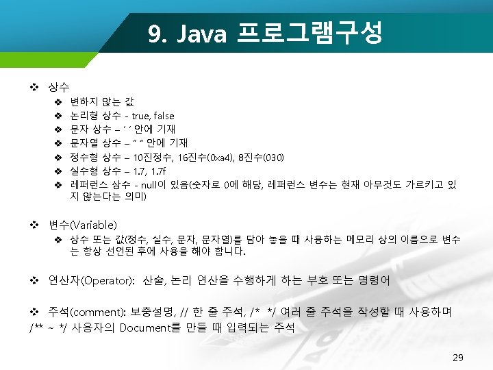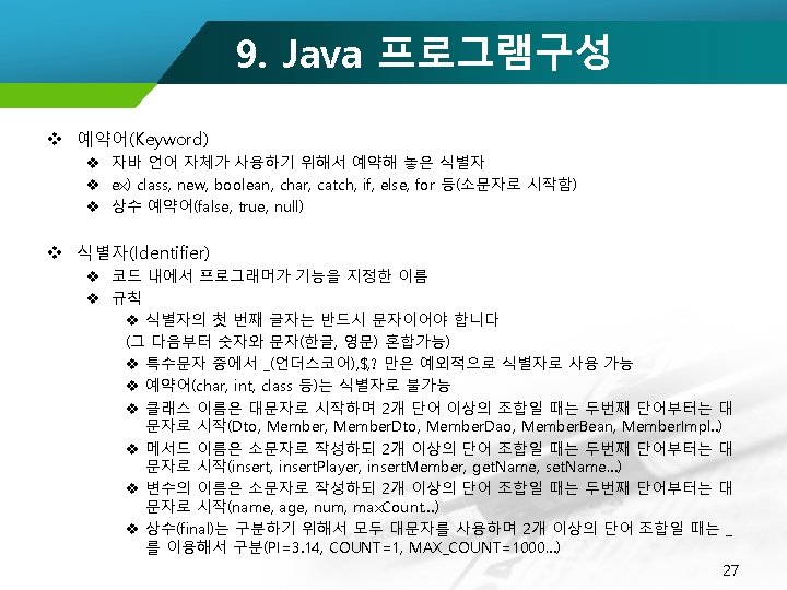 9. Java 프로그램구성 자바 키워드 abstract continue for new switch assert default if package synchronized boolean do goto private this break double implements protected throw byte else import public throws case enum instanceof return transient catch extends int short try char final interface static void class finally long strictfp volatile const float native super while 28