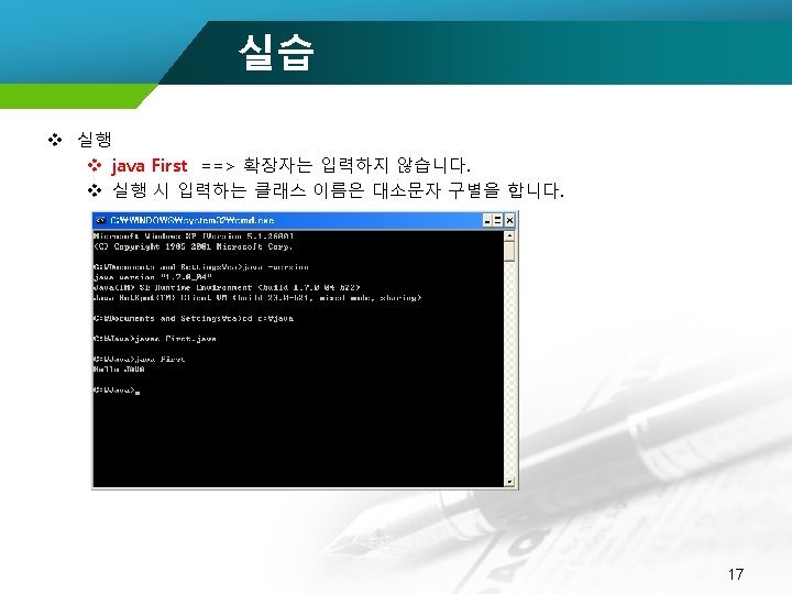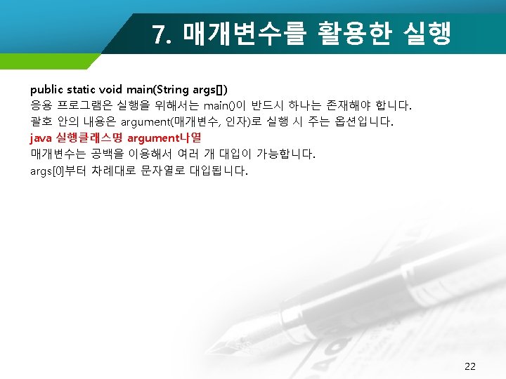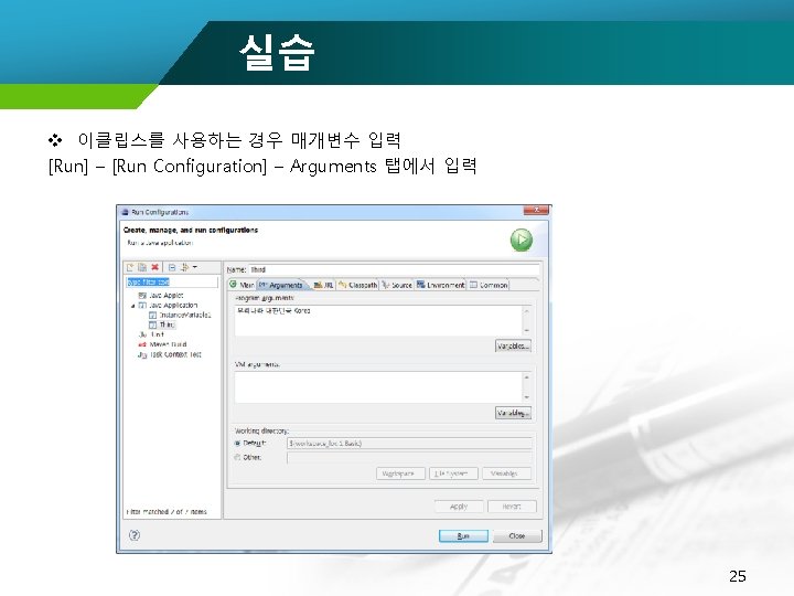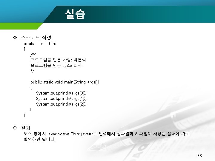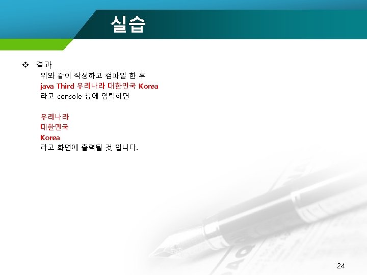 실습 v 소스코드 작성 public class Third { public static void main(String args[]) { System. out. println(args[0]); System. out. println(args[1]); System. out. println(args[2]); } } 23