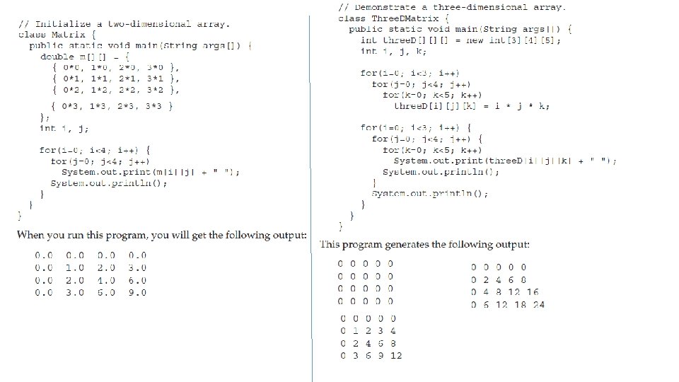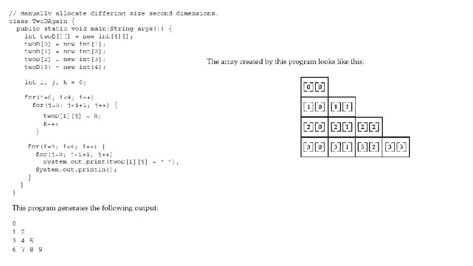 Alternative Array Declaration Syntax • There is a second form that may be used to declare an array: type[ ] var-name; • For example, the following two declarations are equivalent: int al[] = new int[3]; int[] a 2 = new int[3]; • The following declarations are also equivalent: char twod 1[][] = new char[3][4]; char[][] twod 2 = new char[3][4]; • This alternative declaration form offers convenience when declaring several arrays at the same time. int[] nums, nums 2, nums 3; // create three arrays. This is similar to int nums[], nums 2[], nums 3[]; // create three arrays