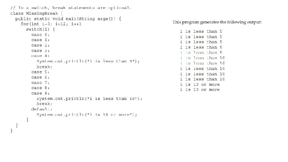 Jump Statements • Java supports three jump statements: break, continue, and return. • These statements transfer control to another part of your program. • Using break § By using break, you can force immediate termination of a loop, bypassing the conditional expression and any remaining code in the body of the loop. § When a break statement is encountered inside a loop, the loop is terminated and program control resumes at the next statement following the loop.