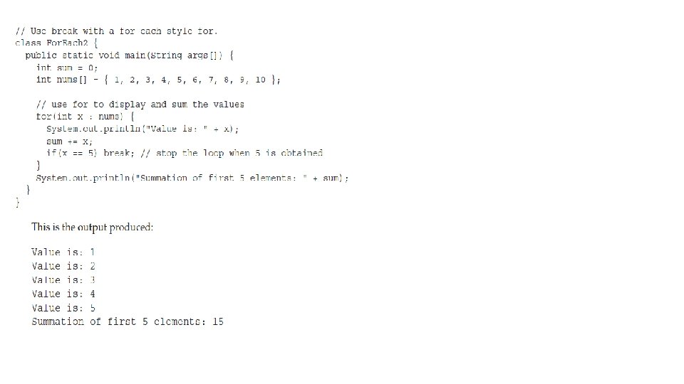 The For-Each Version of the for Loop • Java adds the for-each capability by enhancing the for statement. • The advantage of this approach is that no new keyword is required, and no preexisting code is broken. • The for-each style of for is also referred to as the enhanced for loop. • The general form of the for-each version of the for is: for(type itr-var : collection) statement-block • Here, type specifies the type and itr-var specifies the name of an iteration variable that will receive the elements from a collection, one at a time, from beginning to end. • With each iteration of the loop, the next element in the collection is retrieved and stored in itr-var. • The loop repeats until all elements in the collection have been obtained.