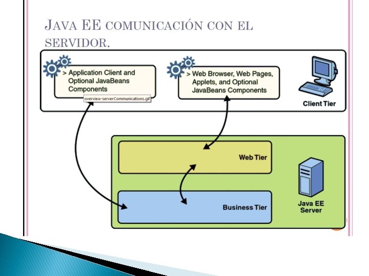 Arquitectura de los componentes Java. Beans � El servidor y el cliente pueden incluir componentes Java. Beans para administrar el flujo de datos entre una aplicación cliente o un applet y componentes que se ejecutan en el servidor JEE o entre componentes de servidor y BD.