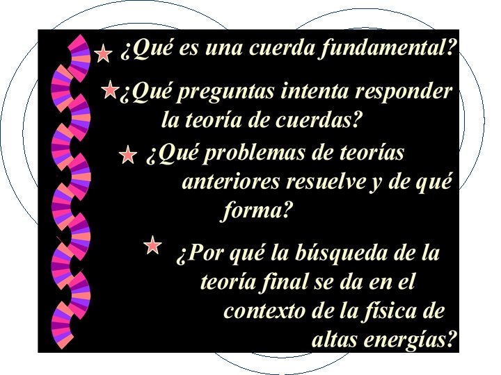 CONCLUSIONES * LA TEORIA DE CUERDAS PROVEE UN MARCO NUEVO PROMETEDOR PARA UNA TEORIA CUANTICA DE LA GRAVEDAD Y POSIBLEMENTE LAS DEMAS INTERACCIONES FUNDAMENTALES * RESUELVEN EL PROBLEMA DE LOS INFINITOS Y ANOMALIAS DE TEORIAS PREVIAS * NO HAY SUPOSICIONES AD-HOC