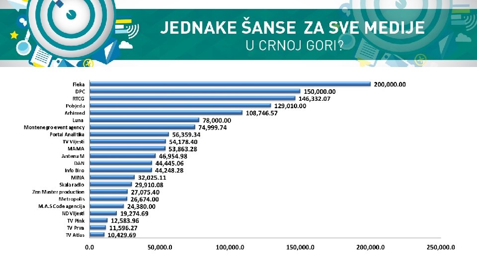 Metodološke napomene Centar za građansko obrazovanje (CGO) je za potrebe istraživanja “Jednake šanse za sve medije u Crnoj Gori”, od maja do decembra 2015, na osnovu Zakona o slobodnom pristupu informacijama, prikupio podatke koji se odnose na to kojim medijima, agencijama za odnose sa javnošću, produkcijskim kućama i agencijama za istraživanje javnog mnjenja, i u kojem iznosu, su organi javnog sektora na osnovu ugovora o pružanju usluga, specijaliziranih usluga ili po drugim osnovima uplatili novčana sredstva.