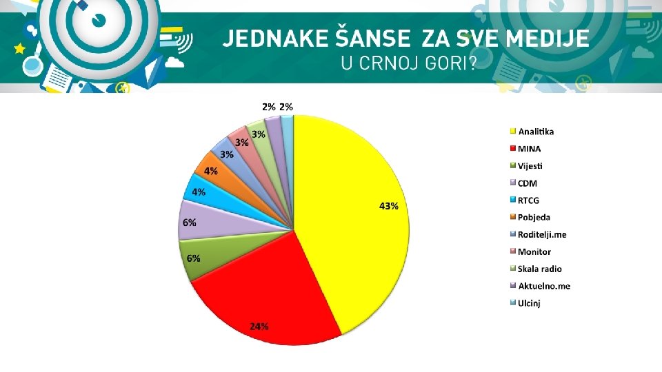 Kako su organi javnog sektora raspodijelili sredstva? Iznos od 2. 125. 791, 78 EUR utrošen je tako što je izdvojeno za: • marketinške agencije i produkcijske kuće 902. 229, 99 EUR ili 42. 4% • radio stanice 511. 097, 34 EUR ili 24% • TV kanale 294. 907, 34 EUR ili 13, 9% • štampane medije 213. 570, 82 EUR ili 10. 1% • portale i informativne agencije 169. 209, 45 EUR ili 7. 96% • ostalo 26. 363, 93 EUR ili 1, 24% • međunarodne i regionalne medije 8. 413, 10 ili 0. 4%