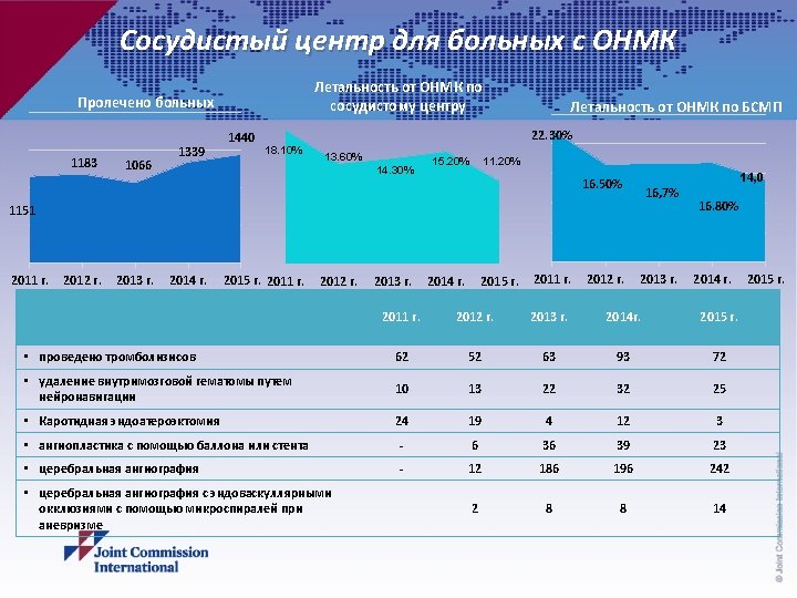 Vascular center for patients with stroke 1183 1066 1339 Mortality from stroke n the vascular center Mortality from stroke in the hospital 1440 22. 30% 18. 10% 13. 60% 14. 30% 15. 20% 11. 20% 16. 50% 16, 7% 1151 2011 г. 2012 г. 2013 г. 2014 г. 2015 г. 2011 г. 2012 г. 2013 г. 2014 г. 14, 0 16. 80% 2011 г. 2012 г. 2013 г. 2014 г. 2015 г. 2011 г. 2012 г. 2013 г. 2014 г. • thrombolysis 62 52 63 93 72 • removal of intracerebral hematoma by neuronavigation 10 13 22 32 25 • carotid endateroektomiya 24 19 4 12 2 • balloon angioplasty or stent - 6 36 39 23 • cerebral angiography - 12 186 196 242 2 8 8 14 • aneurysm embolisation 2015 г. © Joint Commission International related patients
