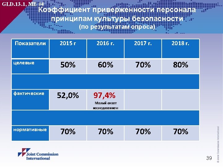 Уровень эпидемиологической надежности ГАУЗ РТ «БСМП» за 2008 -2014 годы в % (The level of reliability of the epidemiological). 101% 92% 91% 86% 95% 96% 92% 89% 85% 86% 83% 76% 2008 г. 2009 г. 2010 г. 2011 г. 2012 г. 2013 г. 2014 г. 2015 г. © Joint Commission International 81%