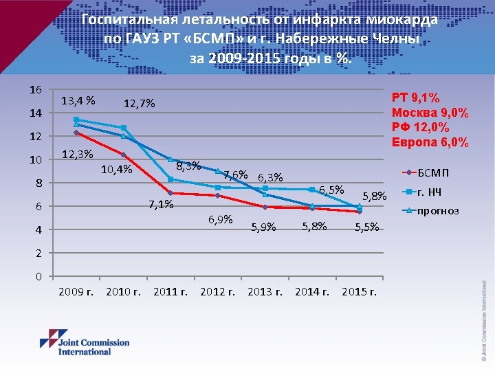 Myocardial infarction hospital mortality for the years 2009 -2015 (%). 16 14 13, 4 % 12, 7% 12 10 8 6 4 12, 3% 8, 3% 10, 4% 7, 1% 7, 6% 6, 3% 6, 9% БСМП 6, 5% 5, 8% г. НЧ прогноз 5, 9% 5, 8% 5, 5% 0 2009 г. 2010 г. 2011 г. 2012 г. 2013 г. 2014 г. 2015 г. © Joint Commission International 2