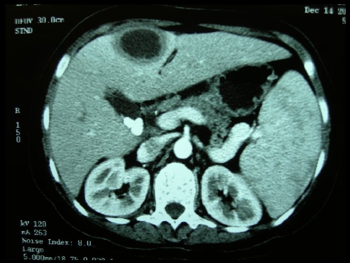 Question 4 • A 34 -year-old woman complained right upper quadrant pain and fever for five days. Mild localised tenderness was elicited at the right upper quadrant. She was not pregnant. BP was 109/61 mm. Hg and pulse rate was 102/min. (a) Suggest 4 differential diagnoses. (b) List 3 abnormalities of the CT film.